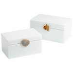Modern-organic loveliness graces this classic glass container. A sleek, glossy white finish adorns the exterior of this accent box, topped with a decorative gem stone accent serving as its handle. Store your jewelry, small electronics, trinkets, or any other personal items in the Bijou container. This tabletop accessory is available in a small and large option for added versatility. Display on a bedroom dresser, powder room counter, or sitting room coffee table to add a natural elegance to your ensemble.